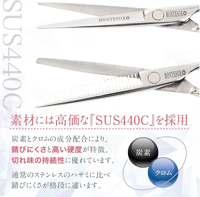 【素材へのこだわり】錆びにくい高い硬度に定評がある、SUS440Cを採用。通常のステンレスハサミに比べ錆びにくさが格段に違います。