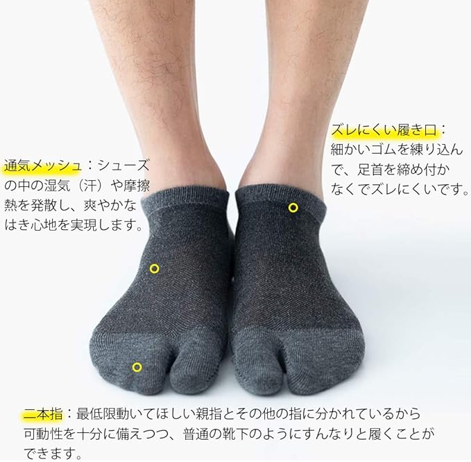 2本指ソックスは最低限動いてほしい親指とその他の指に分かれているから可動性を十分に備えつつ、普通の靴下のようにすんなりと履くことができます。