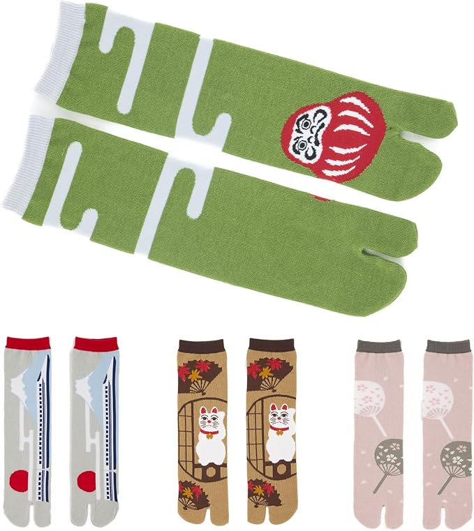靴下の一大産地、日本・奈良で作られたのレンオリジナルの足袋靴下4種セットです。かわいらしくユニークなデザインで、招き猫やだるま、富士山や舞妓といった日本らしいモチーフやご当地柄をあしらった足袋靴下です。かかとを作っていないので、履きやすく、足のサイズを気にせず選べるため、海外の方へのウィットに富んだ日本土産としてもおすすめです。大人用・子供用とお揃い柄なので、家族でお揃いで履いても可愛いです。