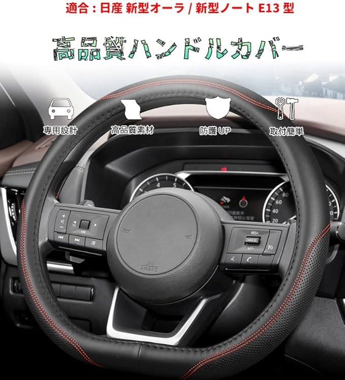 Bmolpt ハンドルカバー 適用日産 新型オーラ(AURA) FE13 FSNE13 E13型(2021年9月~現行) 新型ノート E13 SNE13 E13型(2020年12月~現行)レザー素材ステアリングカバー 内装 アクセサリー カスタム パーツ カー用品 汚れ防止 傷防止 専用設計 簡単取付 1pcsセット(レッドステッチ) | oioioichan