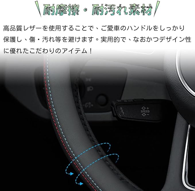 【上質な材質】:このハンドルカバーはレザー製です。高級車のインテリアによく使われる素材で、肌にやさしく通気性に優れています。寒い時期に手のひらに触れると暖かくなります。同時に、長時間運転しても疲れや蒸れを感じることはありません。オールシーズン対応、夏にハンドルの熱さや冬にの冷たさを軽減します。