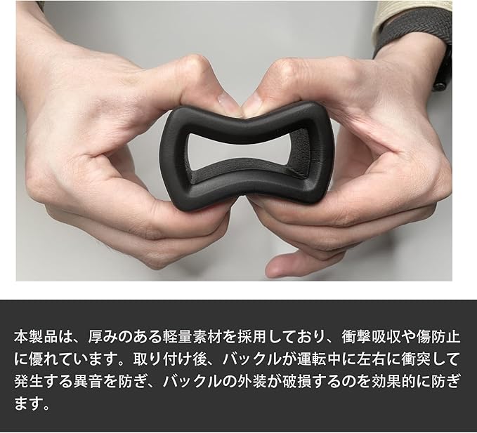 異音&破損防止効果:運転中、バックルが左右に当たって発生するカタカタ音を防止。バックル本体の劣化や表面の剥がれも防ぎ、長く快適にお使いいただけます。