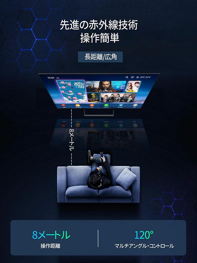 【長距離・広範囲で使用可能】強力な広角赤外線を搭載し、操作距離は約8メートル、左右の制御可能角度は約120度です。 距離や角度に制限されず、部屋の隅々からでも簡単に操作できます。