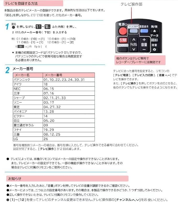 レコーダー、プレーヤーの音量は、テレビの音量を調整することでコントロールされるため、リモコンの音量ボタンを直接押しても、お使いのテレビに対応するメーカー番号を設定しない限り効果はありません。