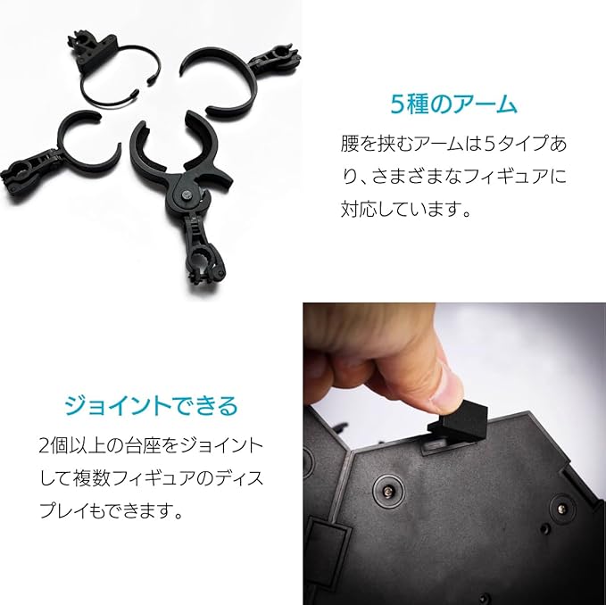 腰を挟むアームは5タイプあり、さまざまなフィギュアに対応しています。