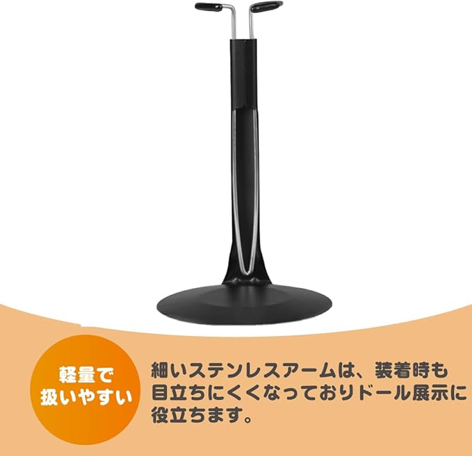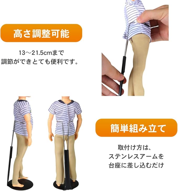 【高さ調整可能】フィギュアをベストな定位置になるよう高さの調整が可能です。13~21.5cmまで調節ができとても便利です。取付け方は、ステンレスアームを台座に差し込むだけで簡単に組み立てができます。細いステンレスアームは、装着時も目立ちにくくなっておりドール展示に役立ちます。