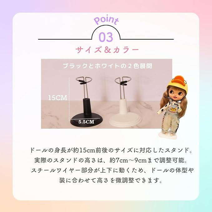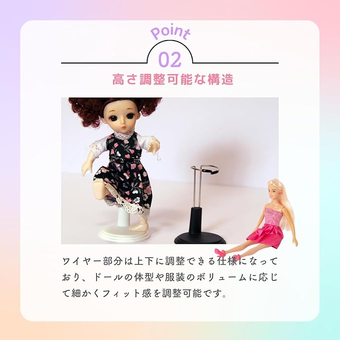 【高さ調整可能な構造】ワイヤー部分は上下に調整できる仕様になっており、ドールの体型や服装のボリュームに応じて細かくフィット感を調整可能です。