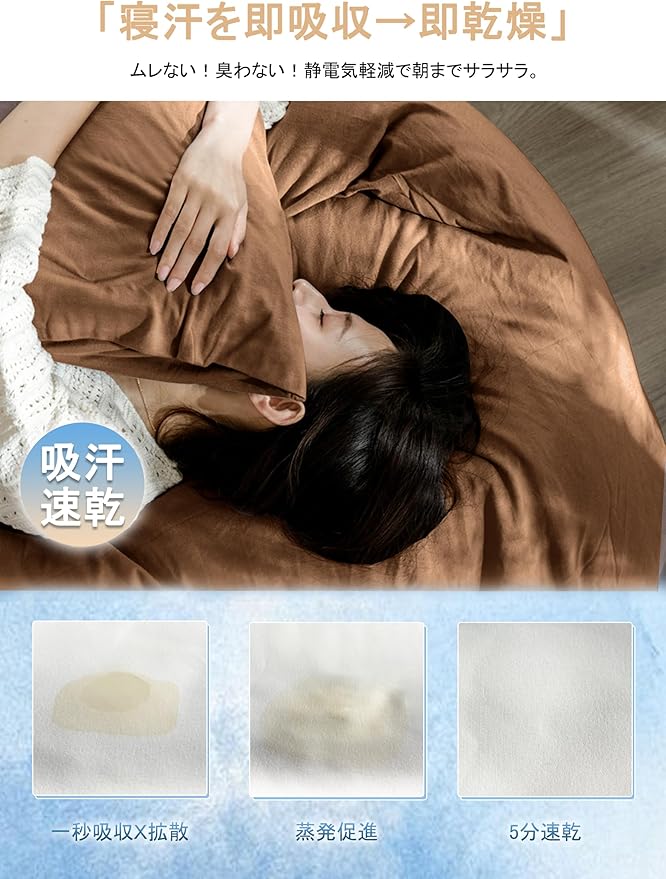 【吸湿速乾|汗や湿気をサラッと快適】吸湿性に優れたポリエステル繊維が寝汗を素早く吸収し、洗濯後は即日乾燥可能。夏は涼しく、冬は適度な保温性でオールシーズン快適にご使用可能。抗菌防臭性能もあり、汗や皮脂による雑菌繁殖・ニオイを抑制。