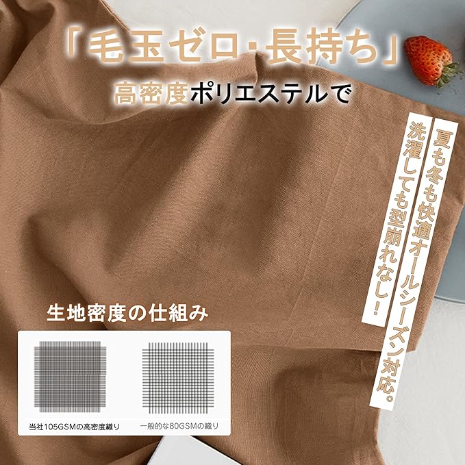 【高密度ポリエステル素材|毛玉なし・静電気軽減】高級ピーチスキン加工で、まるで桃の肌のようななめらかな風合い。高密度ポリエステル100%の特殊配合で、毛玉ができにくく、静電気を抑え、洗濯後も型崩れしにくい耐久性。一般的な枕カバーより厚手でしっかりしているのに、通気性◎で蒸れにくい。