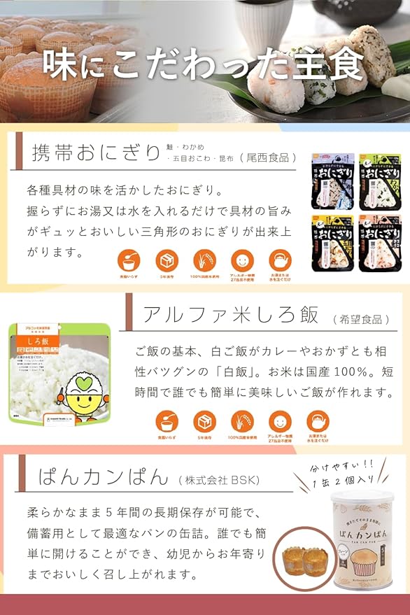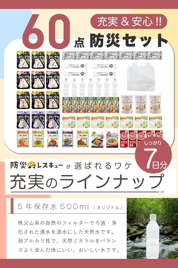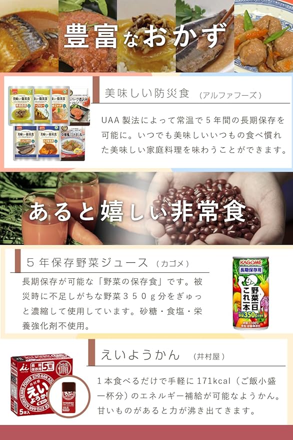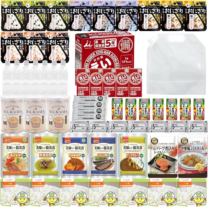 【防災レスキュー】 5年長期保存 防災グッズ 栄養バランスを考えた美味しい非常食 中身だけ 2・3名用 1週間 非常用 60点 給水袋・保存水・ボデイタオル付き【栄養士・防災士監修】 | oioioichan