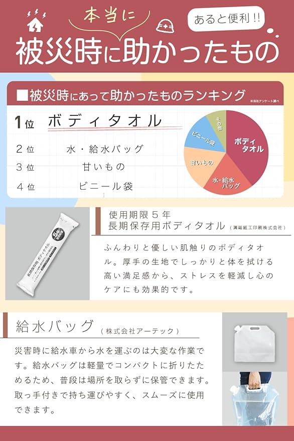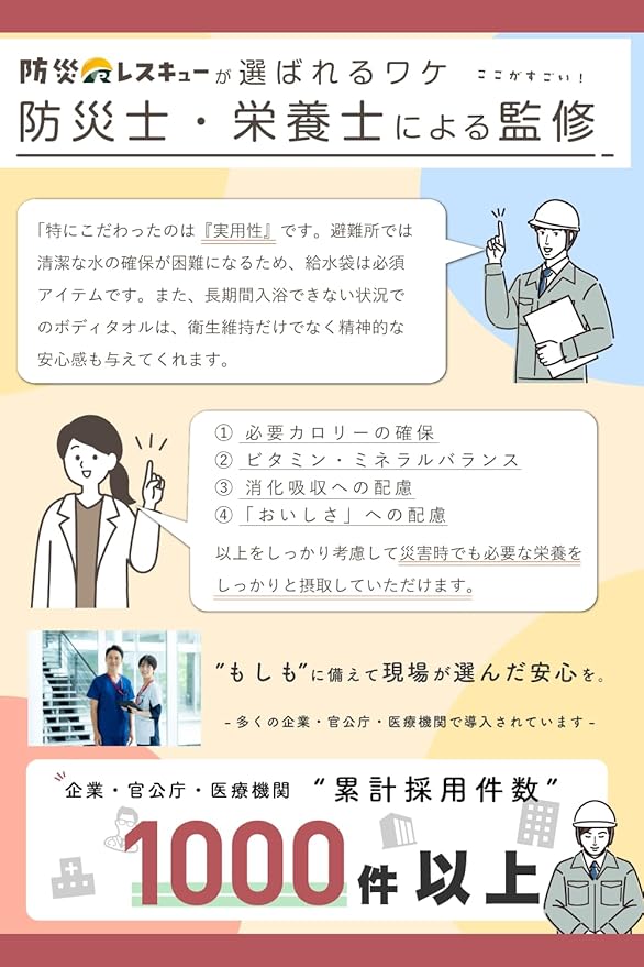 【暮らしを支えるこだわりの防災グッズ】 「防災レスキュー」は、防災士の監修と被災経験者のリアルな声をもとに、本当に必要なものだけを厳選して詰め込んだ防災食です。避難所や自宅での避難生活を少しでも快適に過ごせるよう、衛生面にも徹底的に配慮しました。断水時に欠かせない給水バッグや、お風呂に入れない状況でも身体を清潔に保つためのウェットティッシュ、ボディタオルなど、実際に困るシーンを想定したアイテムをしっかりカバー。