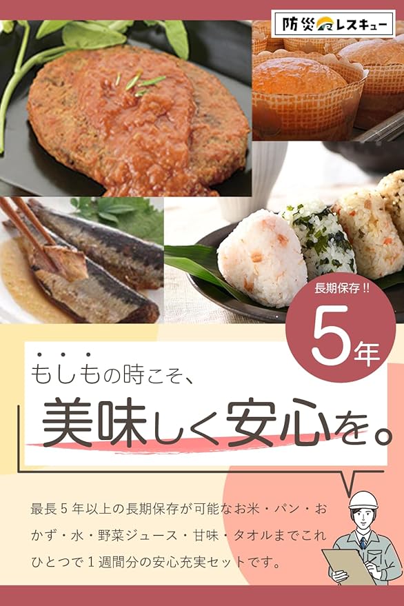 【賞味期限について】 本商品に含まれる非常食は、製造から5年間の長期保存が可能です。 「防災レスキュー」では、賞味期限が4年以上残っているものを良品として厳選・出荷しておりますので、安心して備蓄いただけます。 ※賞味期限のご指定はお受けできかねます。あらかじめご了承くださいますようお願い申し上げます。