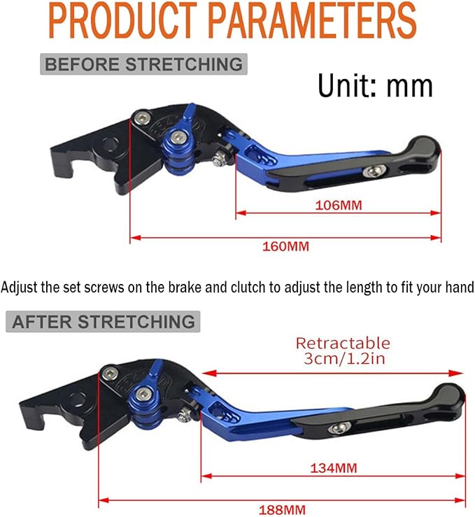 ️【調節可能なデザイン】6段階のギアで指の間隔を自由に調整でき、様々な手のひらのサイズにフィットします。ギアポジションをカスタマイズすることで、ハンドルとクラッチレバーの最適な距離を確保し、運転体験を向上させます。折りたたみ式デザインは、衝突時の曲がりや破損を効果的に防ぎます。長さも調節可能で、必要に応じて適切な長さに調整でき、ブレーキの快適性を最大限に高めることができます。