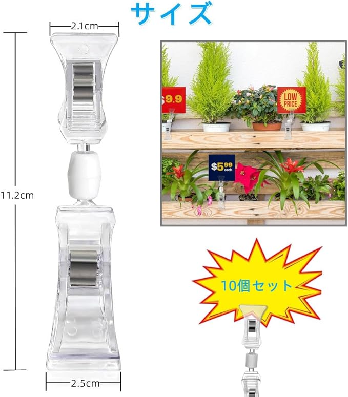 ポップクリップ 10個セット POP クリップホルダー 両端使用可能 クリップ 値札 スタンド プライス用 防水 回転可能 サインホルダー 店舗 展示 スーパーマーケット 果物屋台 衣料品店など用 価格表示 透明 開口部上部1cm 下部3.5cm | oioioichan