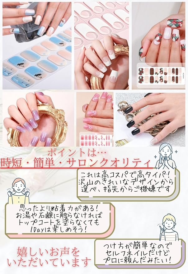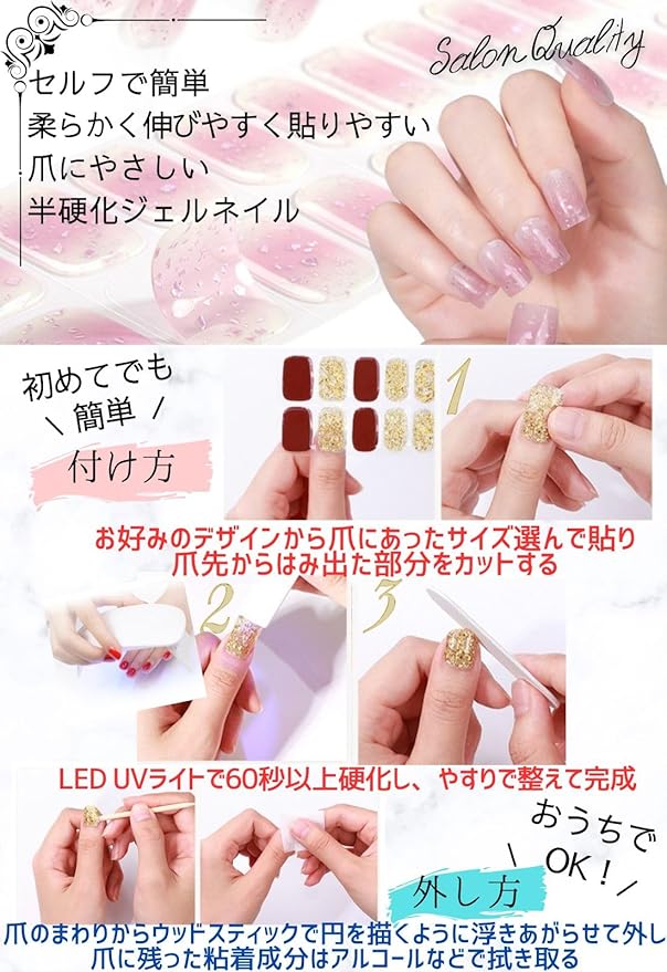 ジェルネイルシートは、ジェル素材で伸ばしやすく柔らかいので、爪のカーブにピッタリ貼れます。さらに、30~60秒UVライトに当て密着力を強化させることで、ネイルシールが浮き上がるのを抑えます。 長時間付着していても爪の負担になりにくく、爪に優しく安心してご使用いただけます。