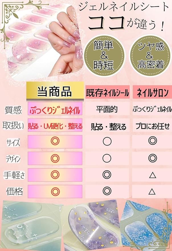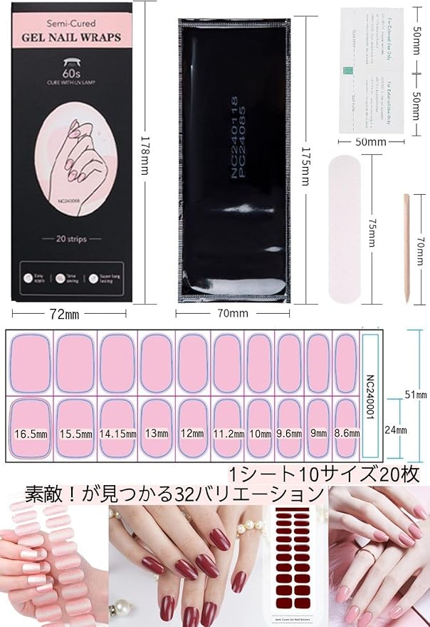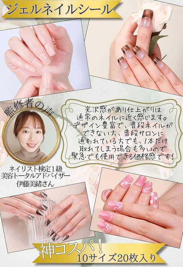 1シートに10サイズ、20枚のジェルネイルシール! 生ジェルを半硬化させたネイルシールで柔らかく伸びやすく貼りやすいです。 LEDライトで硬化させさらに高密着!剥がれにくくつけ方も簡単!セルフネイルなのにサロンの様な立体感&ツヤ感に仕上がり、ネイルポリッシュやジェルネイルに比べ時短でぷっくりとした美しいネイルを楽しめます。豊富なバリエーションからシーンに合わせてセレクトください