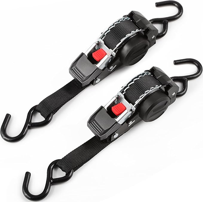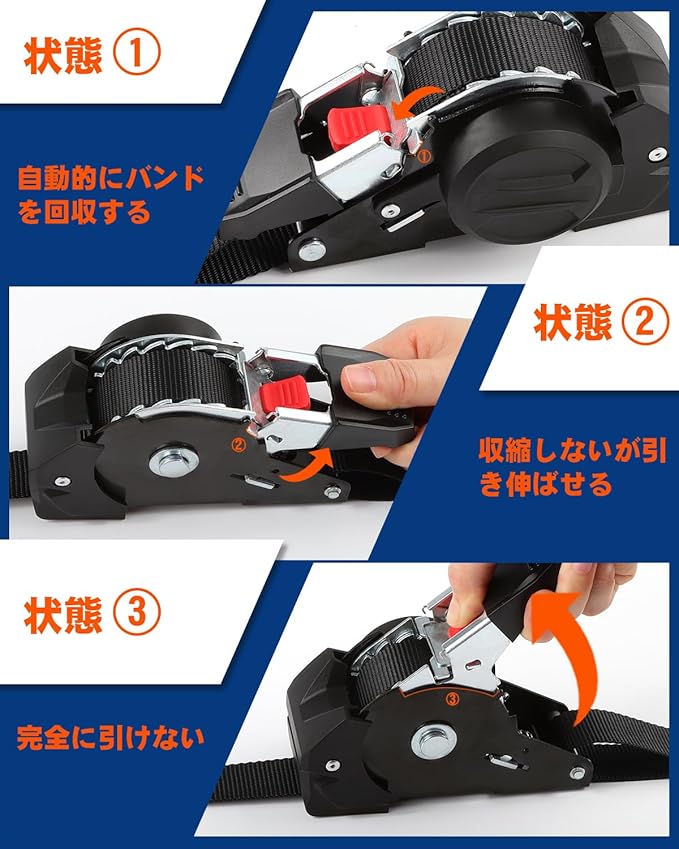 【自動巻き取り式】ボタンを一つクリックするだけで、余分な荷締めベルトの長さを簡単に引き戻せます。