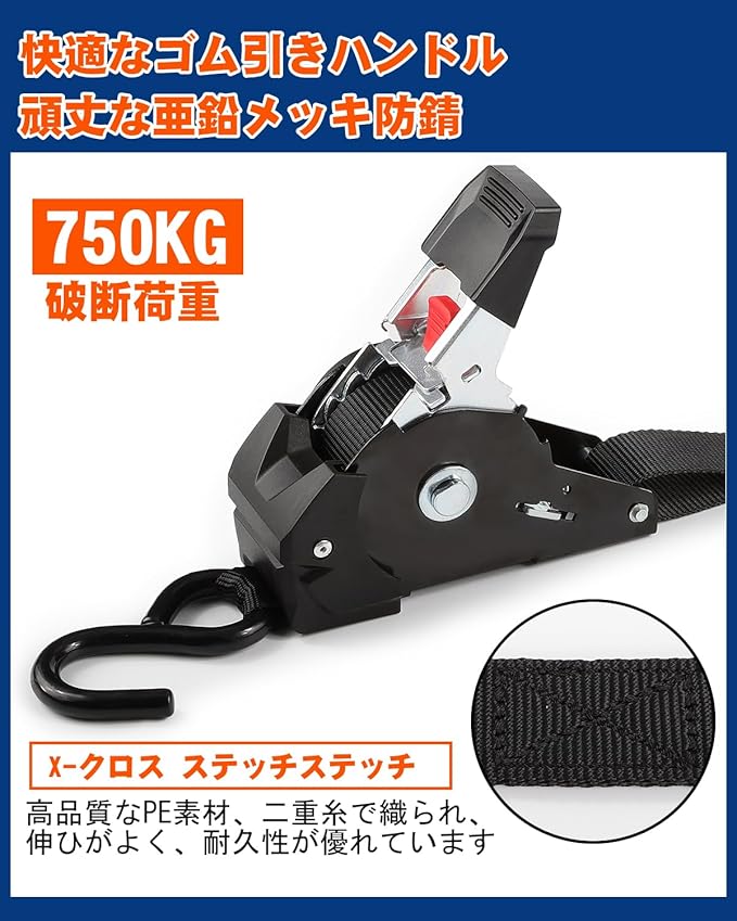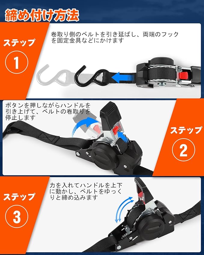 【ラチェット機能】荷締めベルトはラチェット機能付を搭載し、荷物をしっかり締め付けます。引き出すだけで長さを調節可能で、荷締め作業がスムーズかつ簡単です。