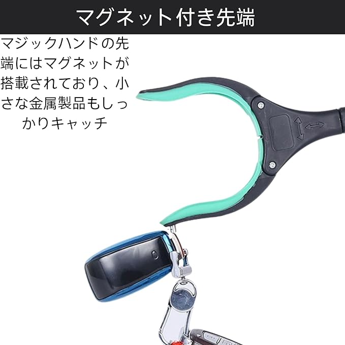 マグネット付き先端:マジックハンドの先端にはマグネットが搭載されており、小さな金属製品もしっかりキャッチ。ゴミ拾いや日常の様々な場面で役立ちます