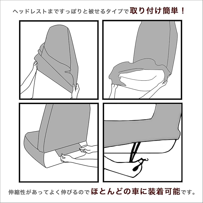【特徴】伸縮性があって、汚れにくく、耐摩耗性に優れたシートカバー。通気性と吸湿性に優れていてオールシーズン対応です。伸ばしながら装着するのでシワができにくくすっきりした見た目に仕上がります。座席にフィットするので、シートとカバーがズレにくく、座った際にお尻が滑りにくく、長時間のドライブも快適。余計な装飾のないシンプルなデザインでどんな内装の車にもよく合います。