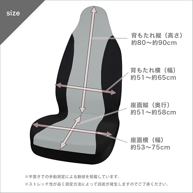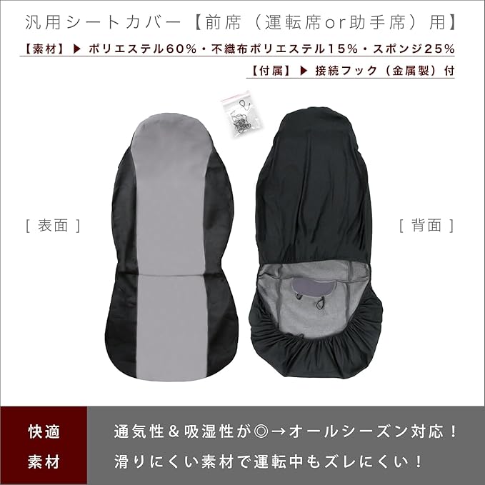 【仕様・内容】前席用シートカバー2枚セットです。運転席・助手席のどちらにも使えます。ヘッドレストまですっぽりと被せるタイプで取り付け簡単。◆◆◆適合サイズ◆◆◆シートカバー自体のサイズは、背もたれ部分は、横幅が約51〜約65cm、縦(高さ)が約80〜約90cm。座面部分は、縦幅(奥行き)が約51〜約58cm、横幅が約53〜75cm。(※平置きでの手動測定による数値を掲載しています。※ストレッチ性が高く測定方法によって誤差が発生しますのでご了承ください。)。ストレッチ性が高く、よく伸びるので、多くの車の前席に使用できます。すっぽりと被せて装着するタイプなので、基本的にはヘッドレスト一体型のシートに良い形ですが、伸縮性が高いのでトレーラーヘッドの座席にも装着可能。車種を問わず多くの車の前席に使える汎用タイプです。素材はポリエステル60%・不織布ポリエステル15%・スポンジ25%。背中に当たる部分(背面)と座面は2層構造になっていて肌触りの良いポリエステル層の下に厚さ約2mmのスポンジ層が装着されています。取り付け用のフック(金属製)も付属します。