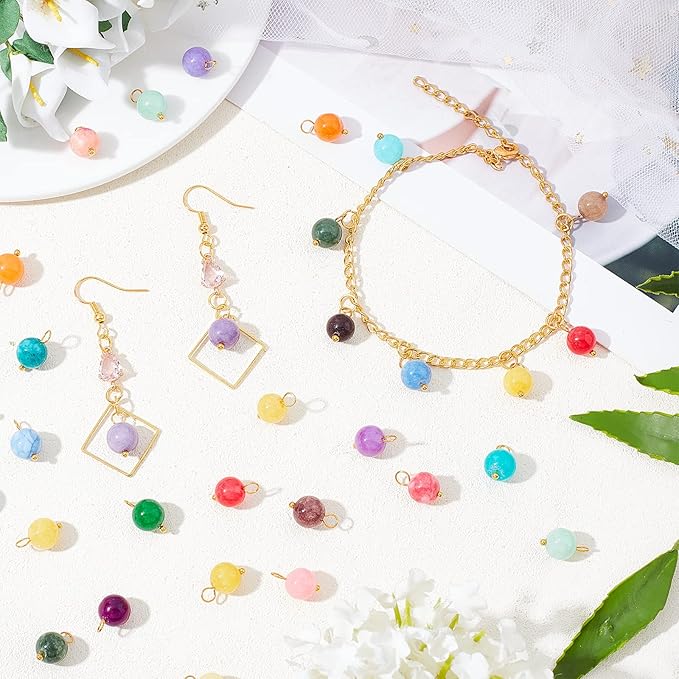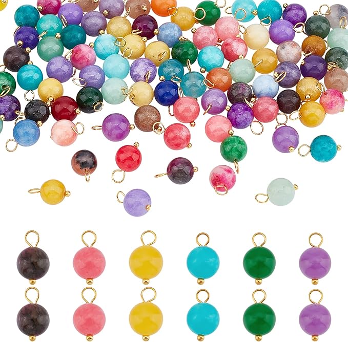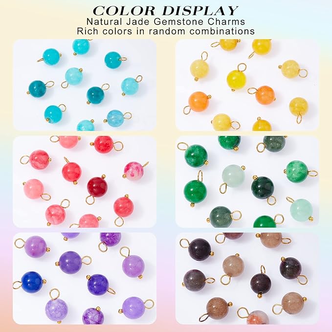 天然ヒスイ ジェムストーン チャーム ラウンド ストーン ペンダント カラフル ゴールデン トーン ブラス ループ 100個入り クリスタル クォーツ ジェムストーン チャーム ネックレス ジュエリー メイキング用 穴:3.3mm | oioioichan