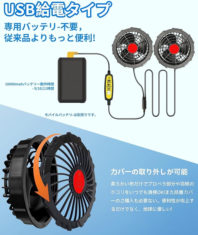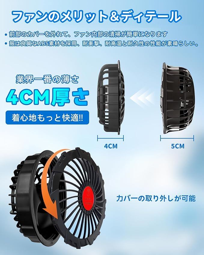 【取り外し可能&ケーブル抜け止め設計 】ファンは取り外し可能な回転式なデザインを採用し、回るだけでファンのカバーを簡単に取り外すことができ、作業服に簡単に装着できるだけでなく、ファンブレードを楽に拭くことができます。作業服ファンにプラグ固定用のフックを追加して、プラグをしっかりと固定させ、より良く接続させてファンへの給電がもっと安定となります。猛暑下で、工場や屋外作業などエアコンの使用できない高温環境でも楽に仕事して、作業効率も一層上げます。"