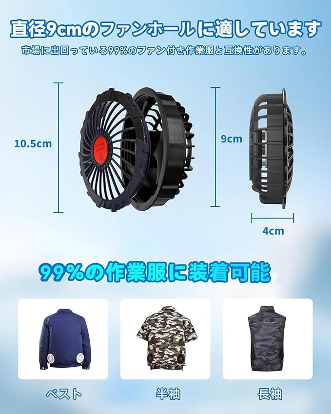 【超薄・軽量&各作業服に対応】空調ベストファンは高品質のABS樹脂素材を採用し、耐衝撃性、耐高温性、耐久性に優れています。ファンの厚さはわずか4cm、重さは約192gで、とても軽くて薄く、体に負担がかかりません。ファンの取り付け口の直径は9cmで、すべての直径9cmのファン専用穴のあるベスト 、半袖 、長袖、自作作業服に完璧に対応できます。猛暑の夏に、アウトドアや室内、屋外作業などエアコンの使用できない高温環境に、こちらの作業服扇風機を使って、暑い夏を涼しく過ごすことができます。これは真夏の熱中症対策の必需品です。