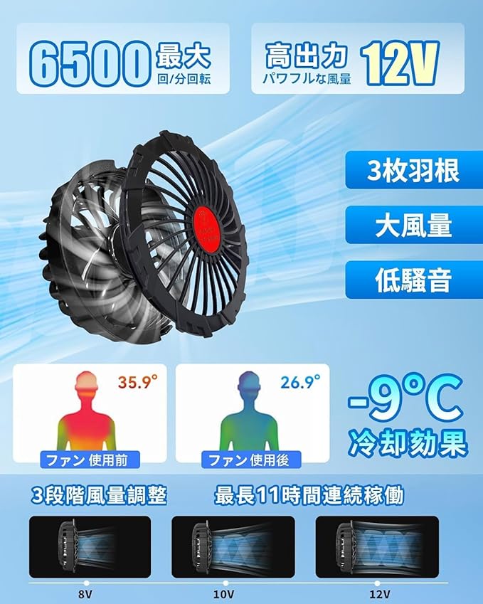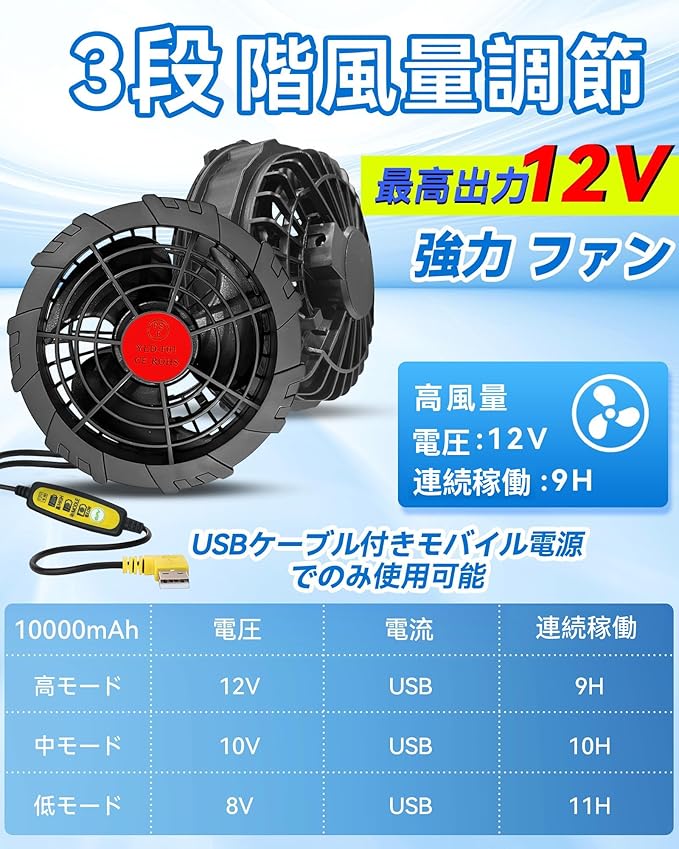 【USB給電タイプ&12V高出力】当社のファンは12V高出力のUSB給電タイプを採用し、風速は従来の5V出力のUSBファンより40%を増やします。40℃の猛暑日でも服内が猛暑知らず楽にすごせます。フル充電後、最小風量で約11時間の連続使用可能、最大風量でも約9時間以上の連続使用が可能です。1日中の作業でも十分対応可能、夏の屋外作業に欠かせない作業服ファンです。(※作業服・.は付属致しませんのでこ注意下さい)