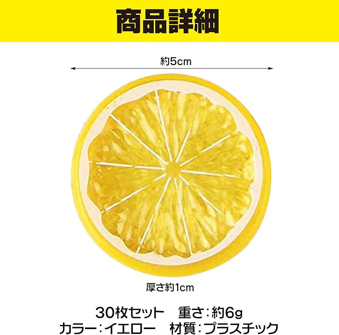セット内容:30枚セット 直径:約5cm 厚さ:約1cm 重さ:約6g カラー:イエロー 材質:プラスチック ※モニターの環境等により、色の見え方に若干差が生じる場合がございます。