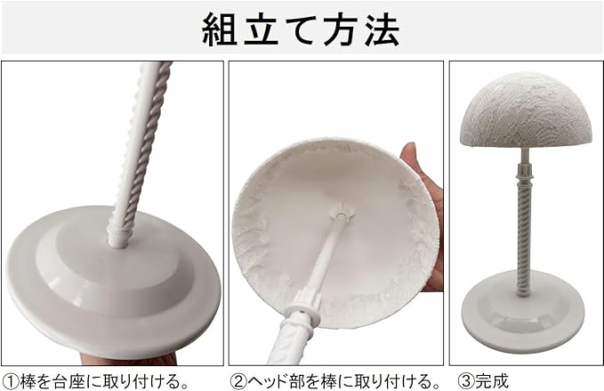 ウィッグの型崩れ防止、ウィッグの後の乾燥、ウィッグの保管、ドライヤーやヘアーアイロン時に帽子台にも便利なアイテムです。