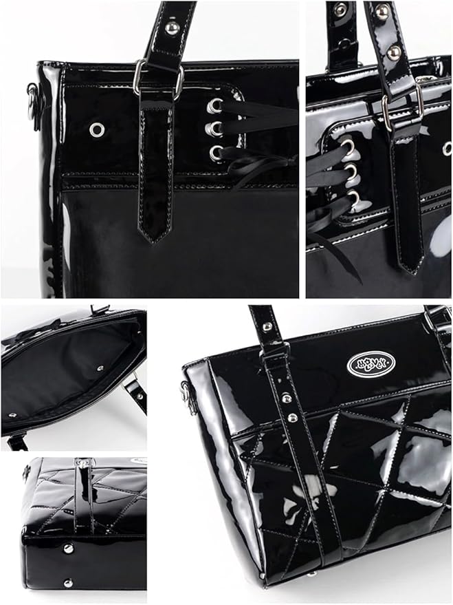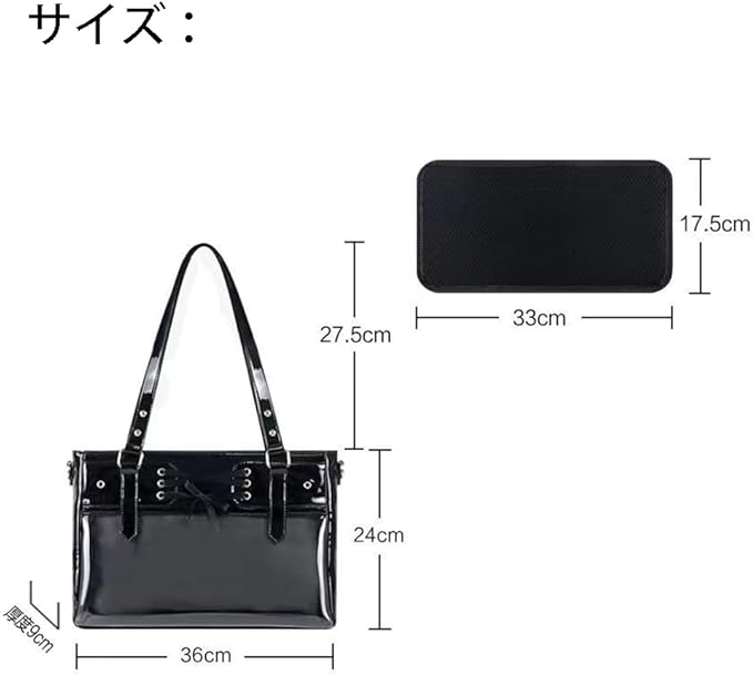 素材:PU、PVC、ナイロン。サイズ :高さ24cm 横36cm マチ9cm 持ち手:27.5cm 重さ:約0.85kg
