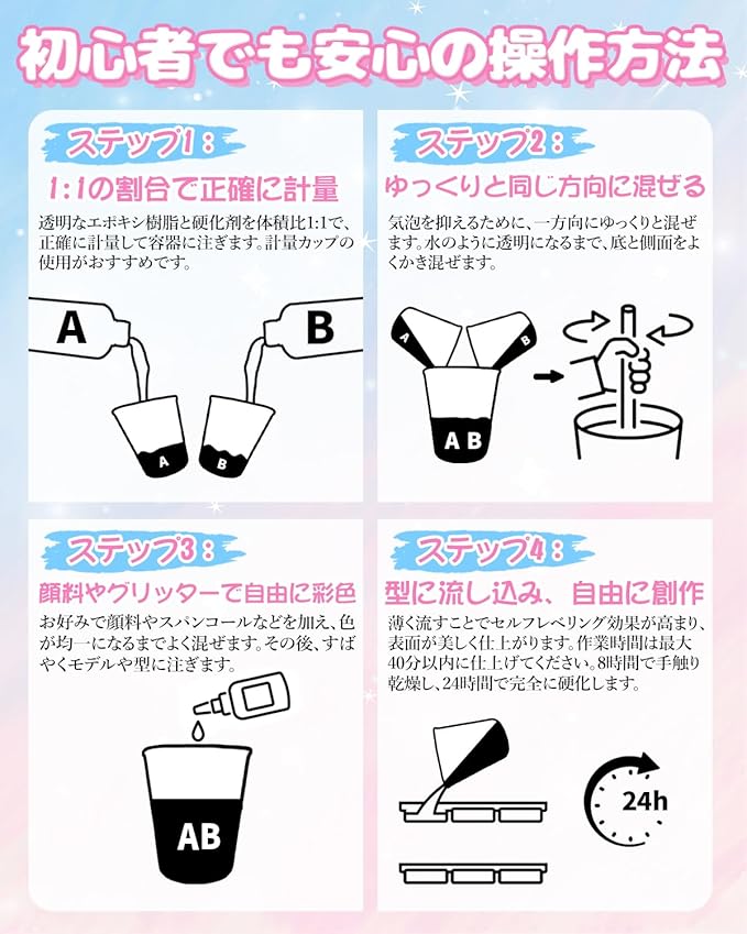扱いやすい: 紫外線をあてることなく、説明書通りに主剤と硬化剤を体積比1:1の割合で簡単に作れます。初心者にも戸惑うことなく良い作品が出来ます。ノート:気温が高い夏は硬化時間は24時間から36時間くらいですが、冬は更に硬化するまでに時間がかかります。冬場はエポキシ樹脂の粘度が上がっているため、湯煎などをしてあげると気泡が抜けやすくなります。