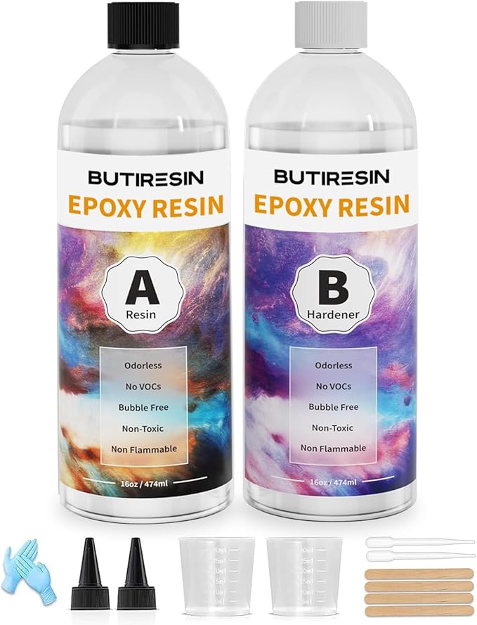 BUTIRESIN レジンキット: 32oz/948mlの2液性エポキシレジンは(主剤16oz+硬化剤16oz)。衛生法適合・大量混合可能・低発熱・超大容量によりたっぷり使えて超優秀!スポイトを使用して正確な量の樹脂を落とします。 計量カップは樹脂容量を完璧に測定できます。手袋は手をしっかり保護します。攪拌棒は樹脂を簡単に混ぜることができ、詳しい説明書付き。
