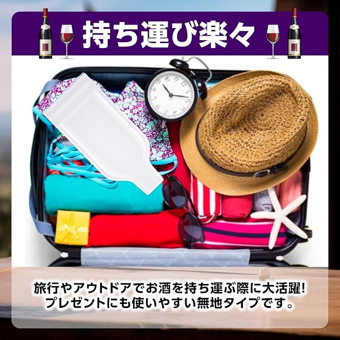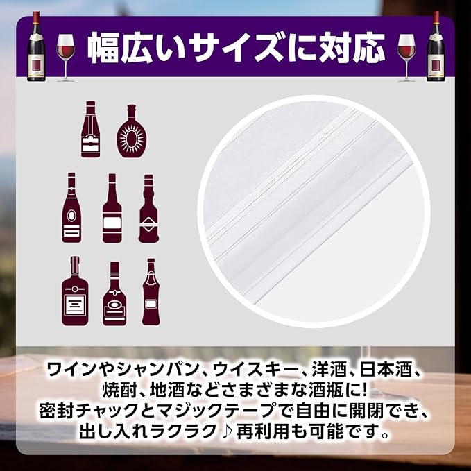 【幅広いサイズに対応】ワインやシャンパン、、洋酒、、焼酎、地酒などさまざまな酒瓶に!密封チャックとマジックテープで自由に開閉でき、出し入れラクラク♪再利用も可能です。