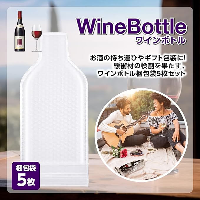 お酒の持ち運びやギフト包装に!緩衝材の役割を果たす、ワインボトル梱包袋5枚セットです。旅行やアウトドアでお酒を持ち運ぶ際に大活躍!プレゼントにも使いやすい無地タイプです。