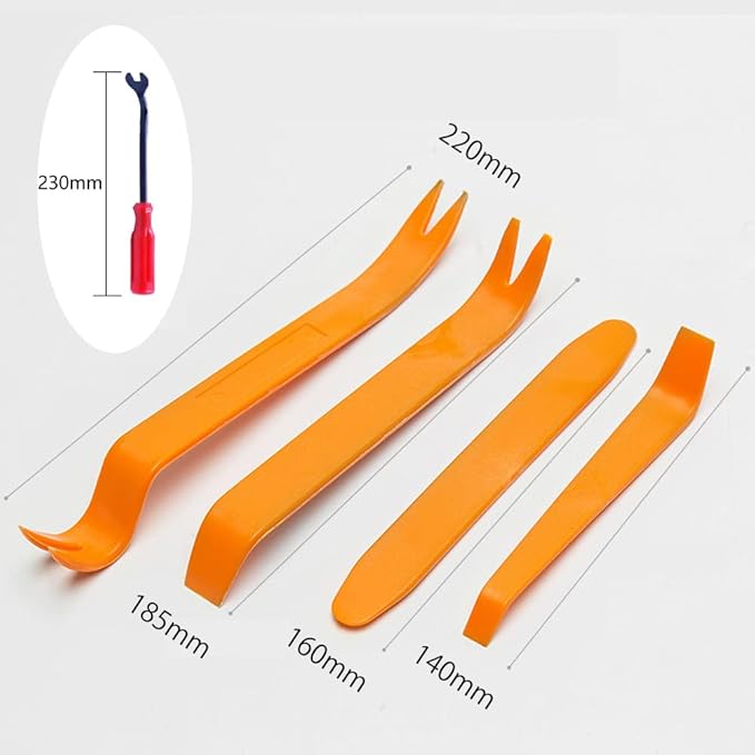 ♢セット内容:脱着工具5本セット(バール工具*4+ クリップクランプツール*1)、サイズ:14CM~16CM、カラー:オレンジ、赤。