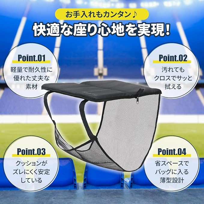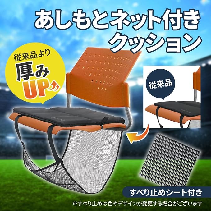 厚みアップ 折りたたみクッション キャンプ アウトドア スタジアムクッション スポーツ観戦 野球観戦 マット ピクニック 釣り 携帯 軽量 スタジアム 椅子 折りたたみ椅子 あしもとネット付きシート (1) | oioioichan