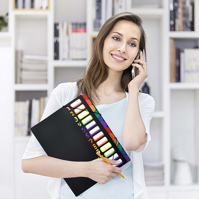 【12仕切りフォルダー】カラフルなポケットが12個付いており、各面は両面デザインで、A4用紙120枚を収納できる大きさです。カバーには12個の小さな空きスペースがあります。ディレクトリをメモして、必要なファイルをすばやく見つけるのに役立ちます。