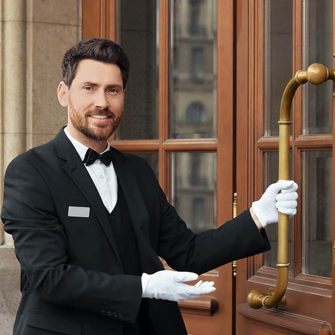 【適用場面] ホテル業務受付、バス運転手、選挙、警備、式典、結婚式、礼服、ジュエリー、時計、貴金属、式典、舞台など様々な場面で使用できます。フォーマル用白手袋は、礼装用、冠婚葬祭業、ドライバー、ホテリエ、警備員、鑑定業など多様なシーンでご活用いただいております。 商品詳細: フォーマル用白手袋 10組セット 【カラー】 純白 【材質】 純綿 【サイズ】 FREE SIZE(全長約23cm)・手の平幅約9cm 【お手入れ】 洗濯可
