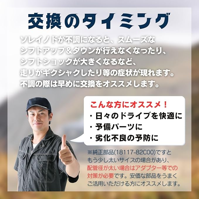 このソレノイドバルブにより、安定したアイドリングと向上したエンジンレスポンスを実現し、車の性能を最大限に引き出します。