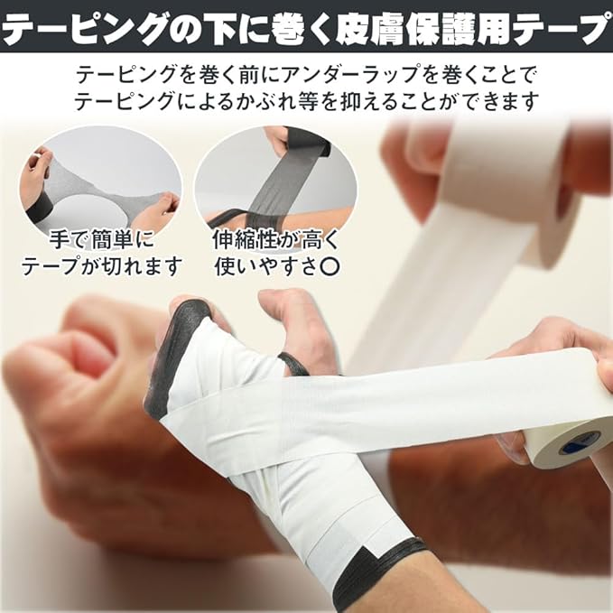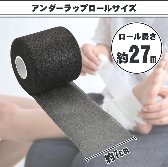 伸縮性に優れたソフトな素材を採用しているので、手首・肘・足首・膝などの関節にも巻きやすいところがポイント。本体は非粘着性によりアンダーラップだけでは固定できないため、上からテーピングを巻いてご使用ください。