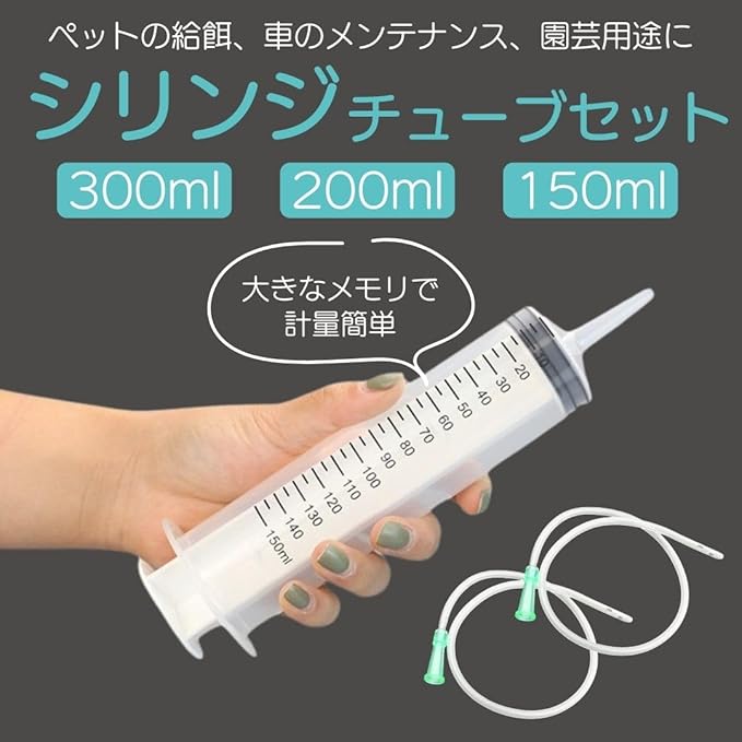 【セット内容】シリンジ 1本、チューブ(約30cm長) 2本 【容量】300ml / 200ml / 150ml 【材質】プラスチック