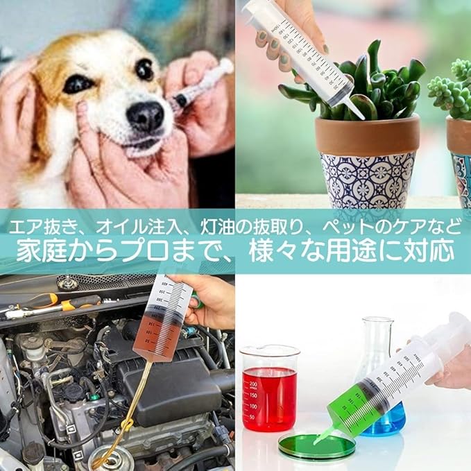 【家庭からプロまで】この大容量シリンジは、エア抜き、オイル注入、の抜取り、ペットのケアなど、様々な用途に対応。家庭内での使い勝手の良さと、プロフェッショナルな作業にも耐えうる耐久性を兼ね備えています。