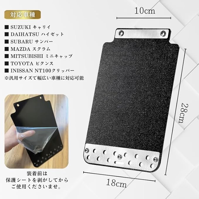 【注意事項】取り付け前に、車両の取扱説明書を必ず確認し、適切に取り付けてください。製品は泥や砂などの飛び散る物質を防ぐ目的で設計されていますが、完全な保護を提供するものではありません。運転時には安全を確保するために適切な注意を払ってください。