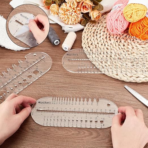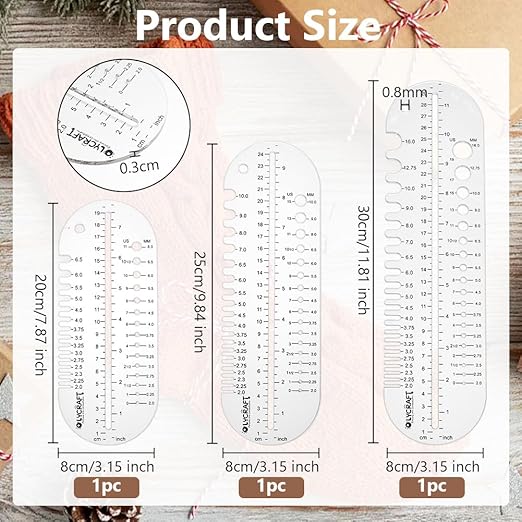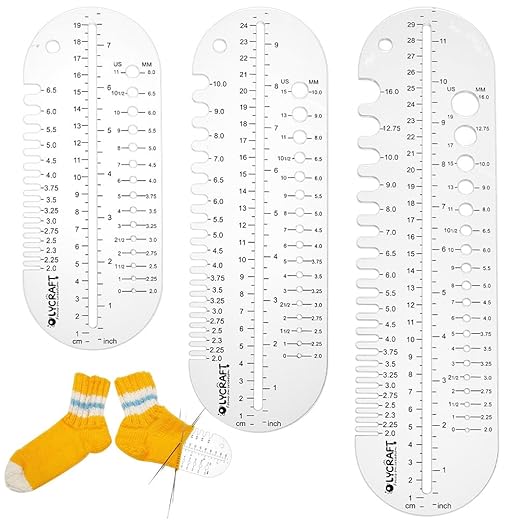 靴下定規 :長さの異なる3種類の靴下定規は、様々な長さの靴下を編んだり測ったりするのに役立ちます。定規表面には半透明のフィルムが覆われていますので、使用前に剥がしてください。