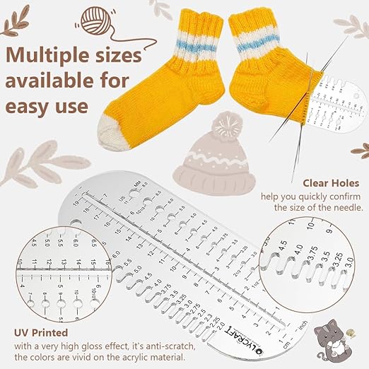 ニードルゲージ:この靴下かぎ針編み定規は、かぎ針編みと編み針のサイズを決めるのに使える、さまざまなサイズの切り込みと穴がデザインされています。