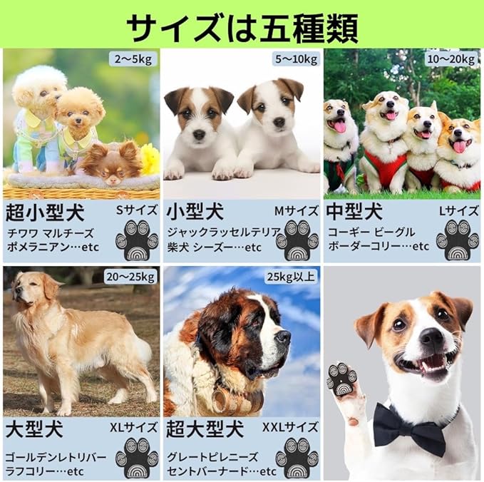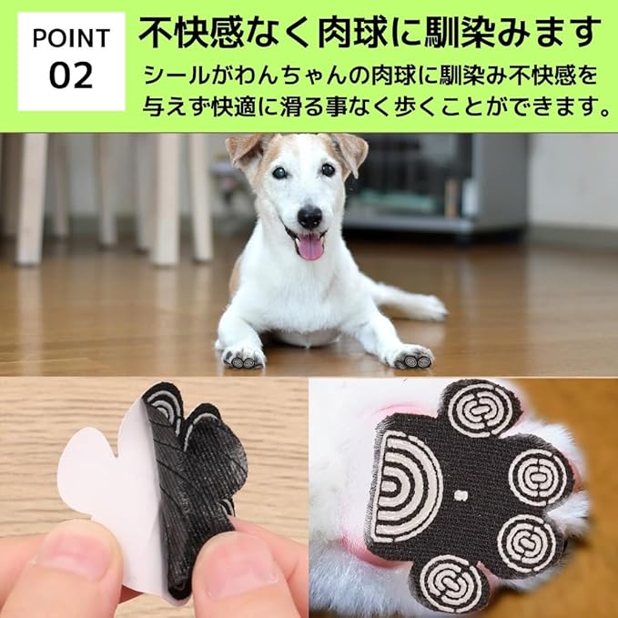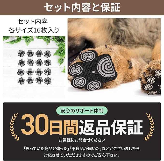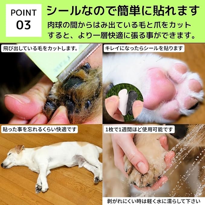 【取り付け方】今まで取り付けたことがない方も、すぐ取り付けることができます。シールなので、ぺたっと貼るだけで取り付け完了です。ここで、注意していただきたいところだけ、お伝えします。 ①取り付ける前に、動物たちの健康状態を確認してください。確認した後、愛犬の肉球を確認して、けが伸びていないかを見てください。もし、伸びている場合は、必ずカットしてから取り付けるようにお願いいたします。 ②肉球が綺麗になったら、後は貼るだけで完了です!