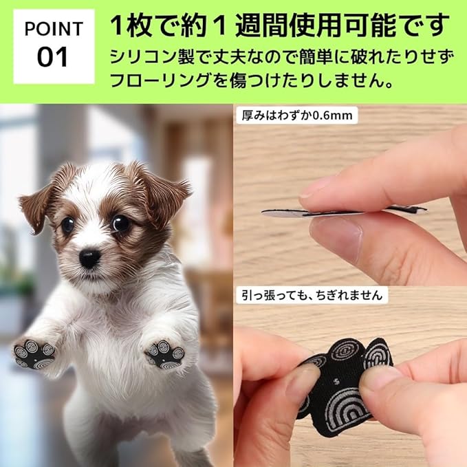 【使用頻度】動物の体調によって、使用頻度が変わりますが、この商品は1枚で約1週間ご使用いただけます。シリコン製で、丈夫に作られていますので、簡単に壊れたり、すぐ取れたりすることはほとんどありません。動物たちが怪我をすることなく、且つ家のフローリングが傷つくことがありません。この商品の厚みは、約0.06mmという超極薄に作られているため、肉球に馴染みやすい仕様になっております。