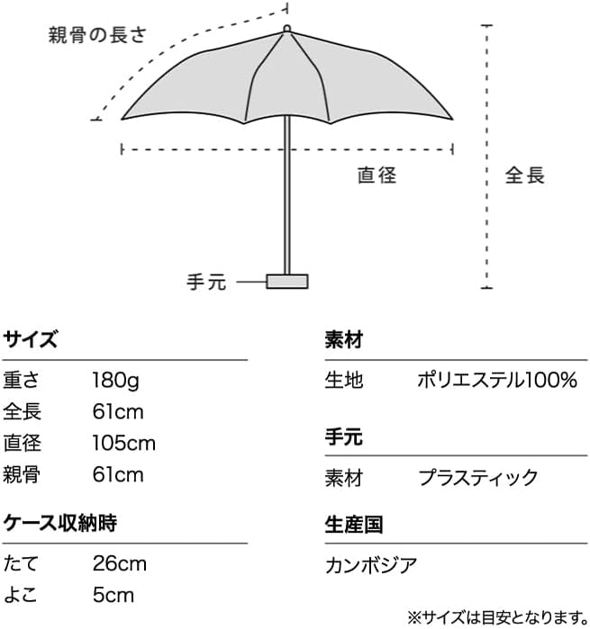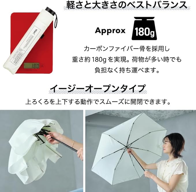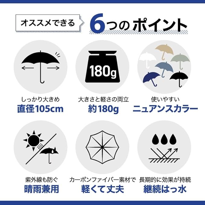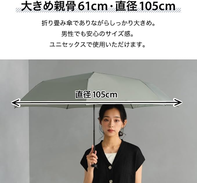 【直径105cm/重さ180g】軽さと大きさのベストバランスを叶える折り畳み傘… 傘骨にカーボンファイバー素材を使用することで、直径105cmという大きさと耐久性を保ちながらも驚きの軽さ180gを実現。 身体も荷物もしっかり守りながら、持ち運びやすい晴雨兼用傘は1年を通じて大活躍です。 シンプルデザインの優しいカラーは、性別年代を問わず、様々なシーンで幅広くお使いいただけます。